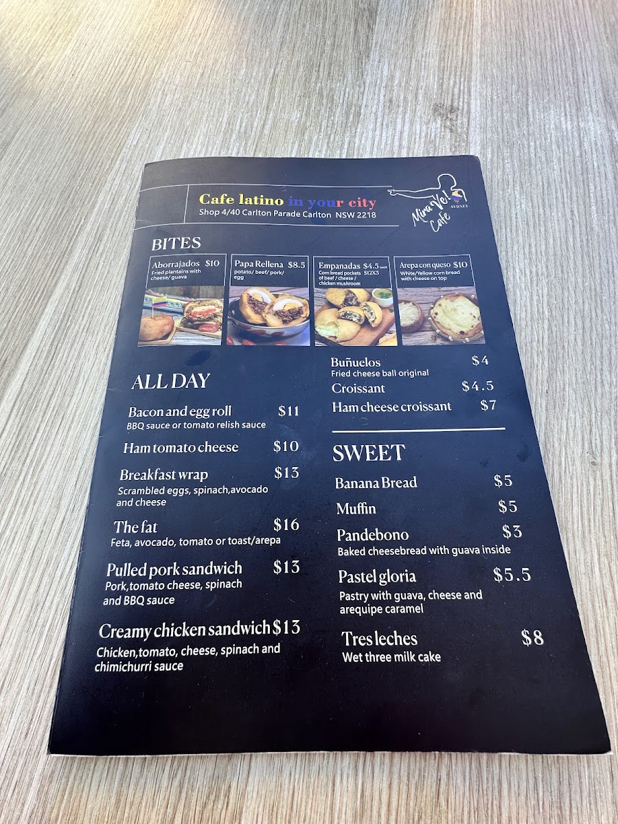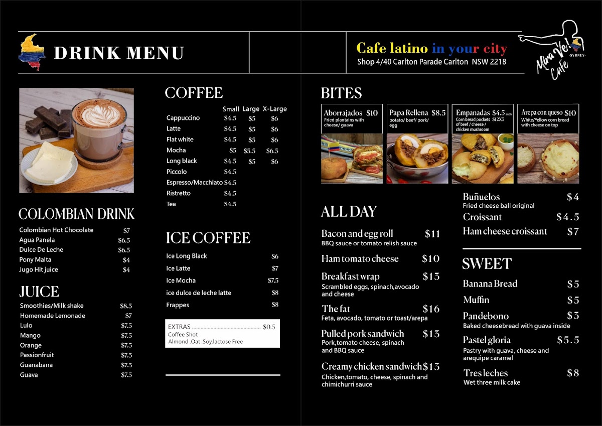 Mira Ve Cafe in Carlton delivers a compact but characterful menu that feels like a warm introduction to Colombian comfort food, with plenty of casual café staples for any time of day. If you want something quick and savoury, the Bites section is a great starting point-Aborrajados, Papa Rellena, and Arepa Con Queso all read like ideal share-plates or snackable add-ons. The all-day lineup keeps things familiar yet satisfying, from the simple Bacon And Egg Roll and Ham Tomato Cheese to heartier picks like Breakfast WrapThe Fat, Pulled Pork Sandwich, and a classic Pulled Pork Sandwich-style lunch vibe that suits a relaxed café stop. For anyone with a sweet tooth, the dessert range is inviting and varied, mixing everyday café treats like Banana Bread and Muffin with more traditional options such as PandebonoPastel Gloria and Tres Leches. Drinks are equally well covered: coffee lovers can stick to essentials like Cappuccino, Latte, Flat WhiteMocha, and Long Black, or switch to something more distinctive from the Colombian drinks list-Colombian Hot Chocolate, Agua Panela, Dulce De LechePony Malta, and Jugo Hit Juice add a clear point of difference. If you’re after something cold, there’s a full iced selection including Ice Long Black, Ice Latte, Ice MochaIce Dulce De Leche Latte, plus Frappes. On the fresher side, juices and smoothies round it out with Smoothies, Homemade Lemonade, LuloMango, Orange, and smoothie options like Banana. Overall, it’s a menu that balances approachable café comfort with Colombian flair, making it easy to visit for a quick bite, a sweet treat, or a drink that’s a little more memorable than the usual.